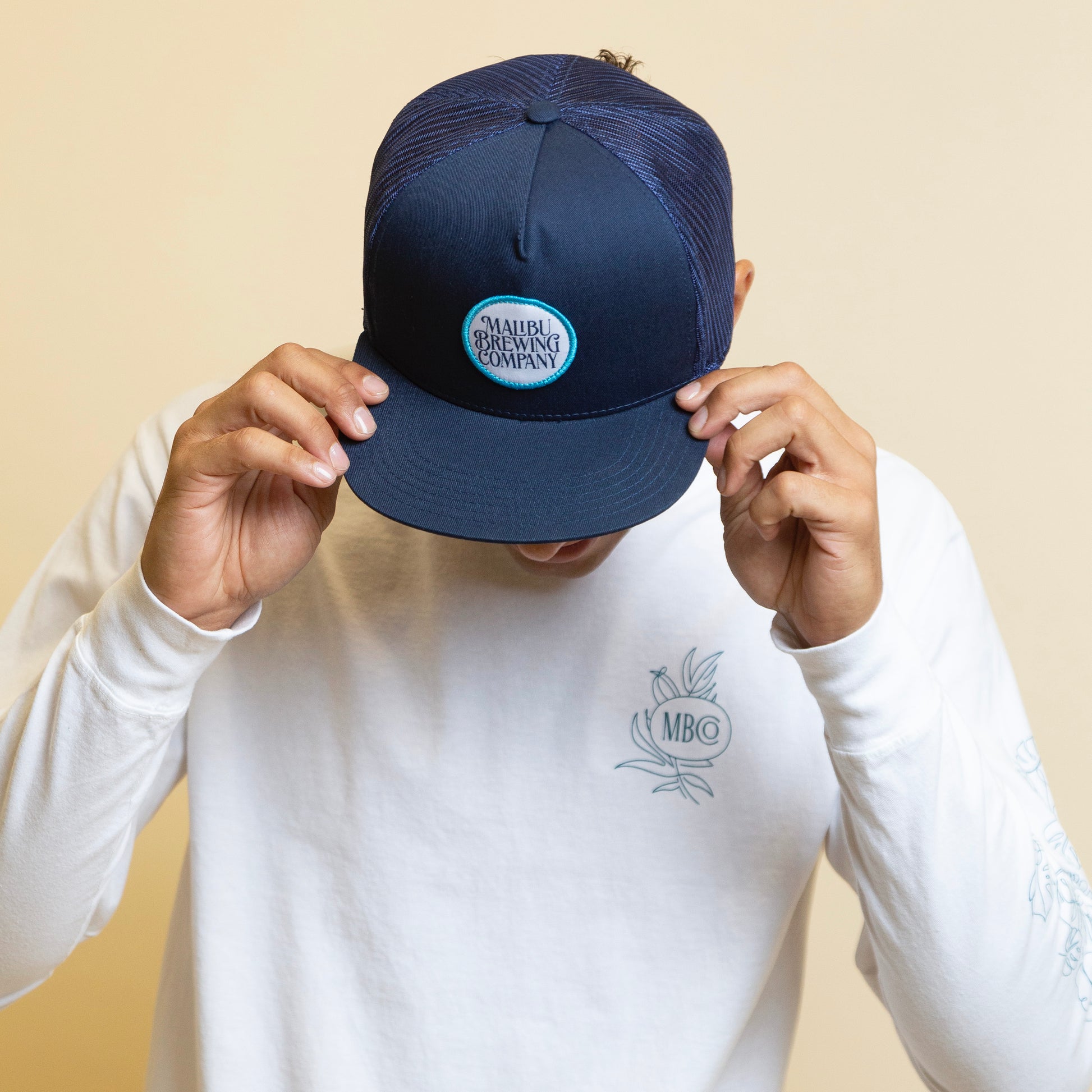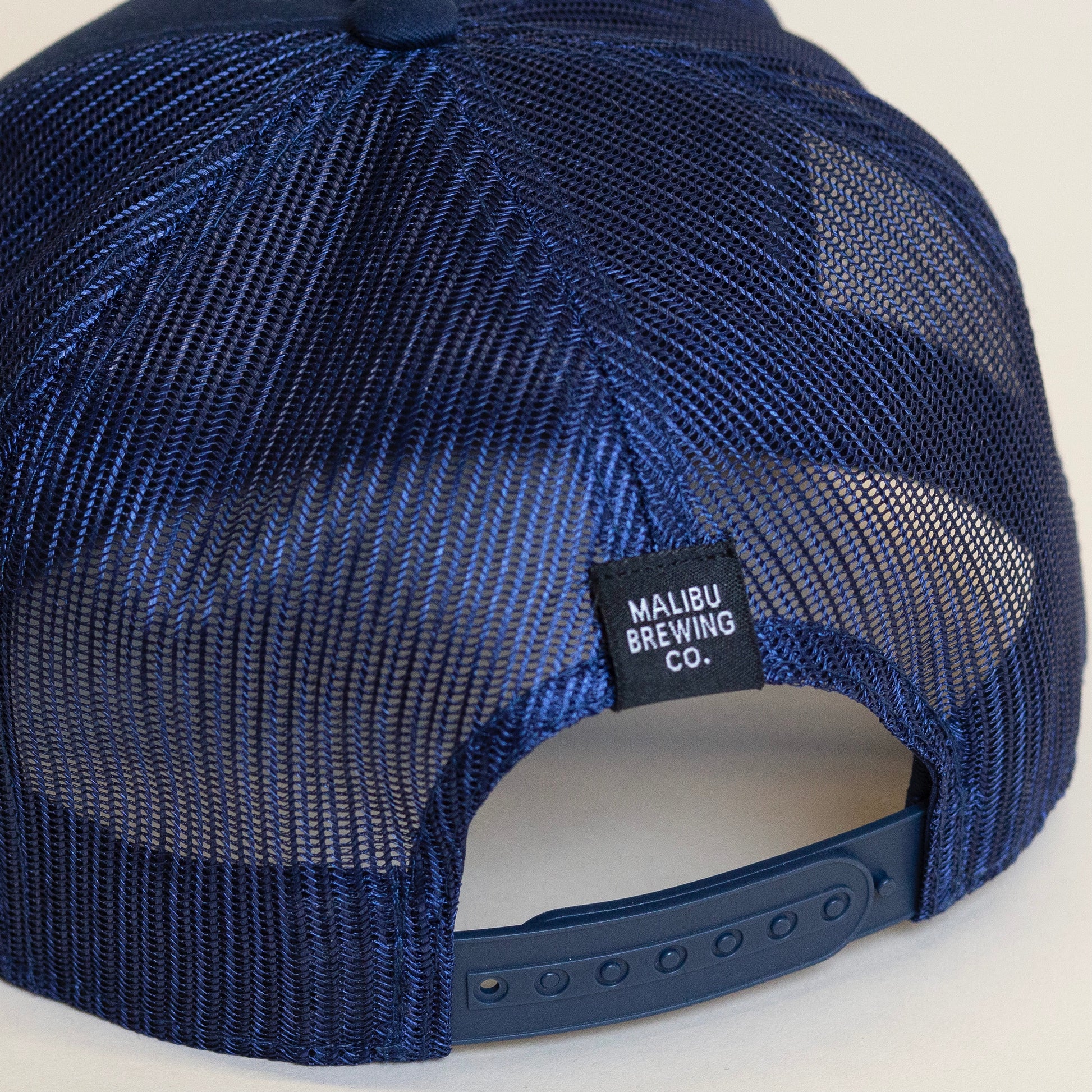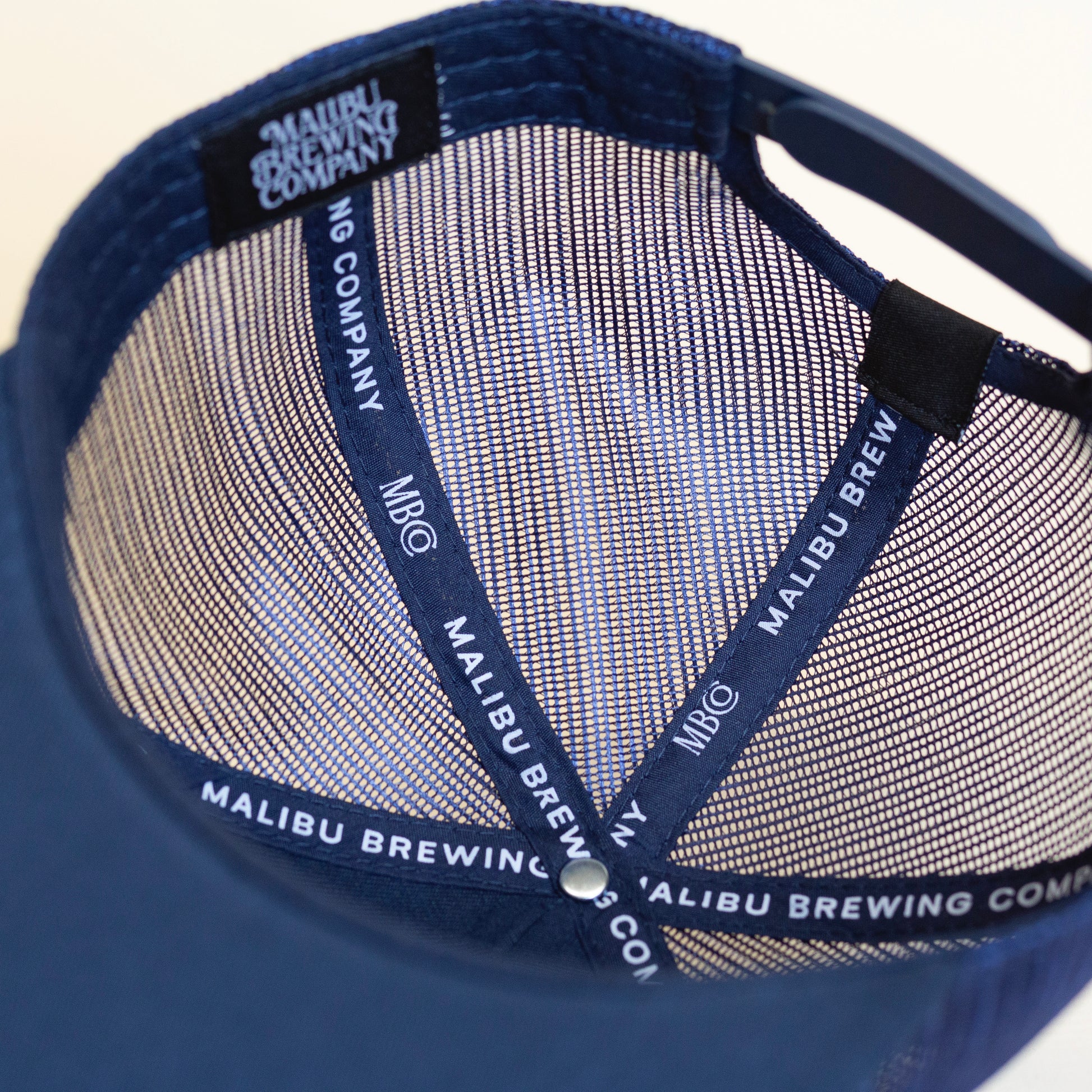High crown trucker hat in vibrant navy blue. This hat features a custom Malibu Brewing Company round patch, stitched for durability. MBC custom clamp tag on back of hat and branded interior taping.